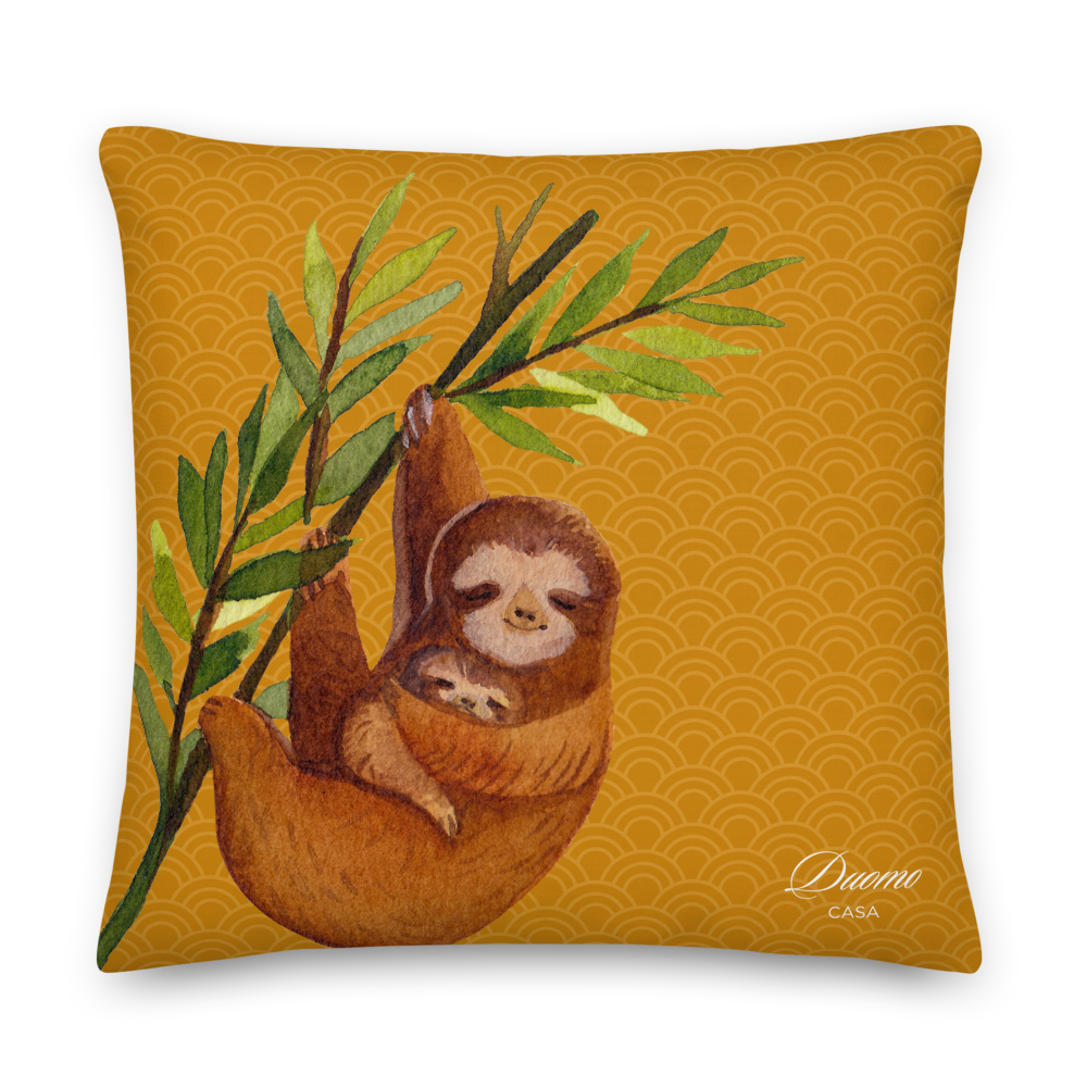 Embodying tender moments of serenity, this cushion features a mother sloth embracing her young amidst lush greenery.